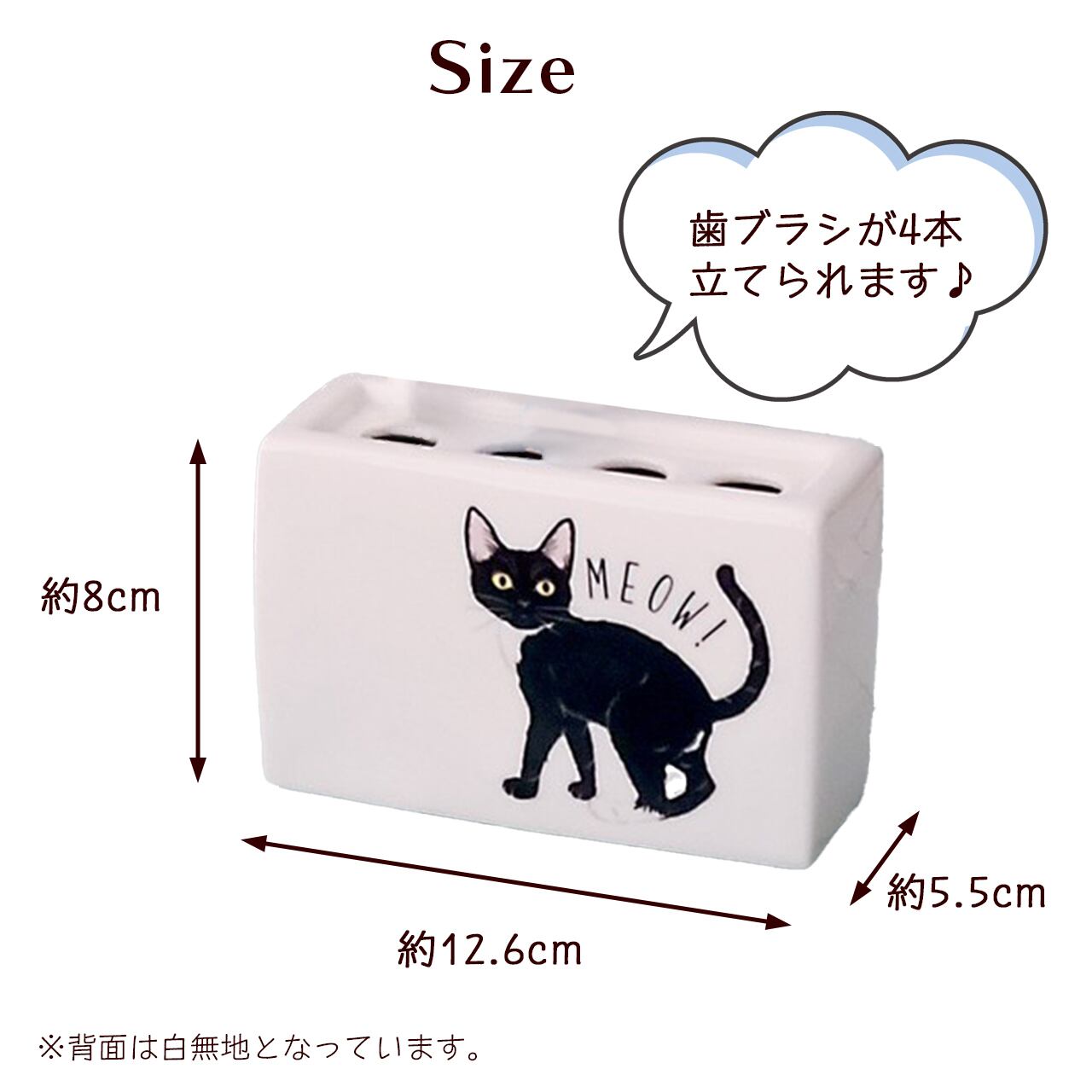 猫たちのしぐさが愛らしい MEOW!MEOW!シリーズの歯ブラシスタンド♪ 4つ穴タイプなので、家族みんなの歯ブラシを1つにまとめられてスッキリ! 清潔感のある白い陶器は、どんな洗面台にも似合いそうです。裏面は開口部が広く、水がたまらずお手入れも簡単です。