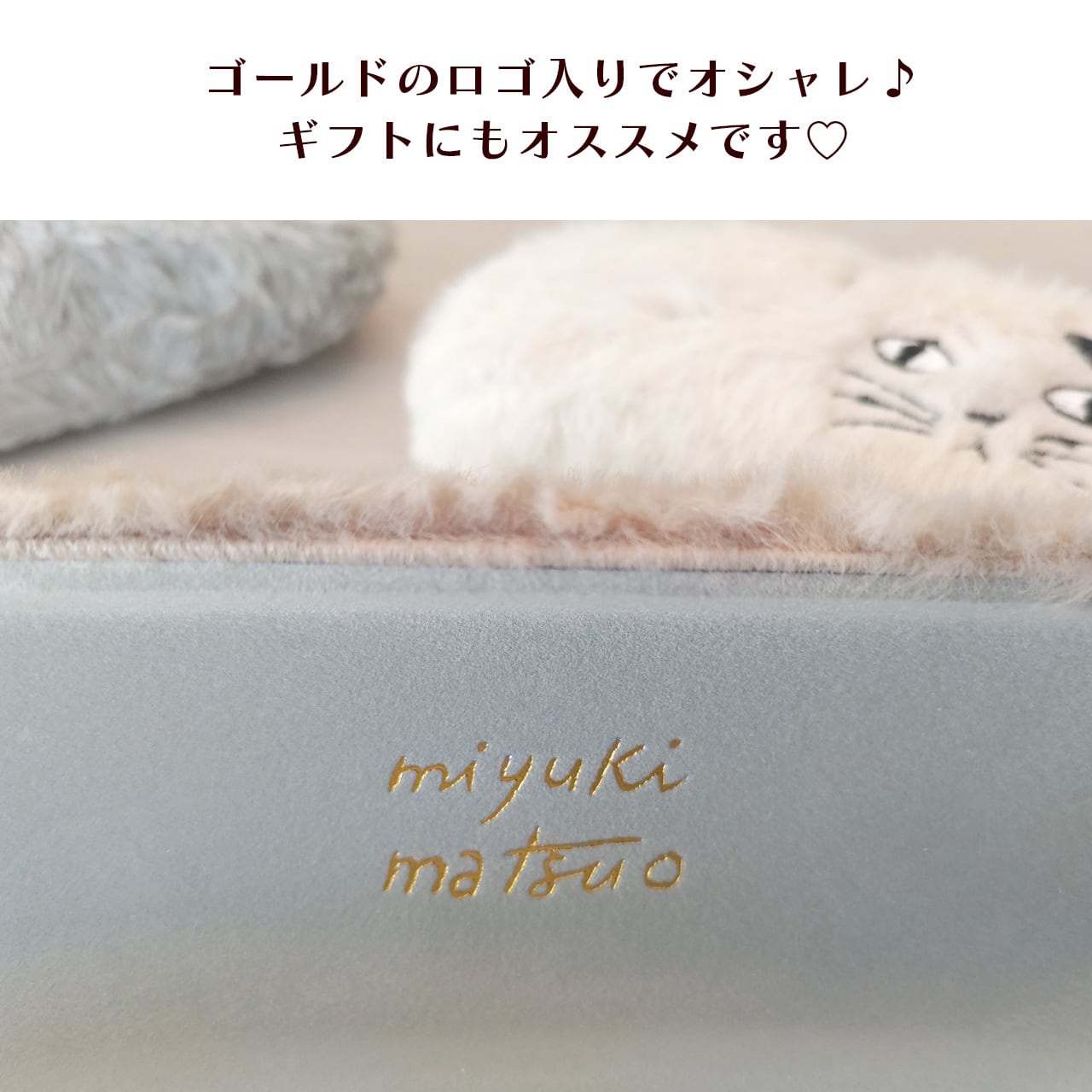とてもなめらかでふわふわのファー素材に、イラストレーター・松尾ミユキさんが描く人気のネコたちの愛らしい表情が刺繍されています。