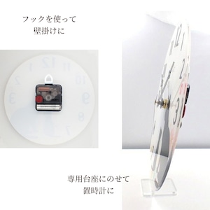 透明感のあるアクリル製で軽く、壁掛け時計としてだけでなく、専用台座を使って置き時計としても使用できる2way仕様。 直径約20cmと小ぶりなので、場所を選ばず使いやすいサイズです。