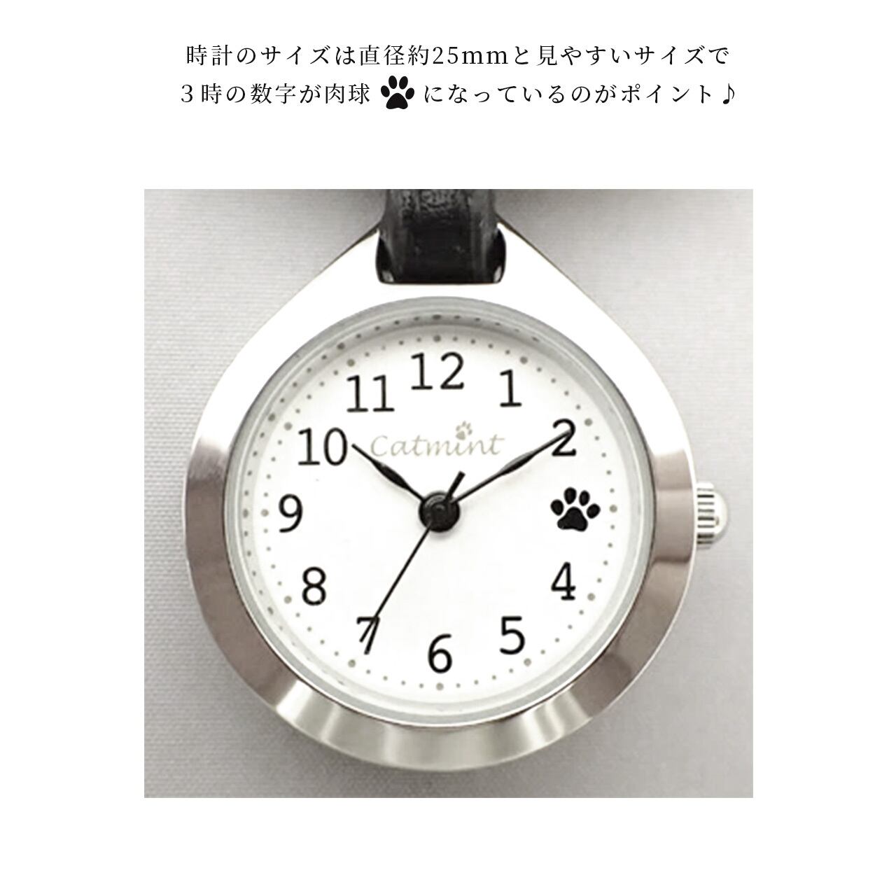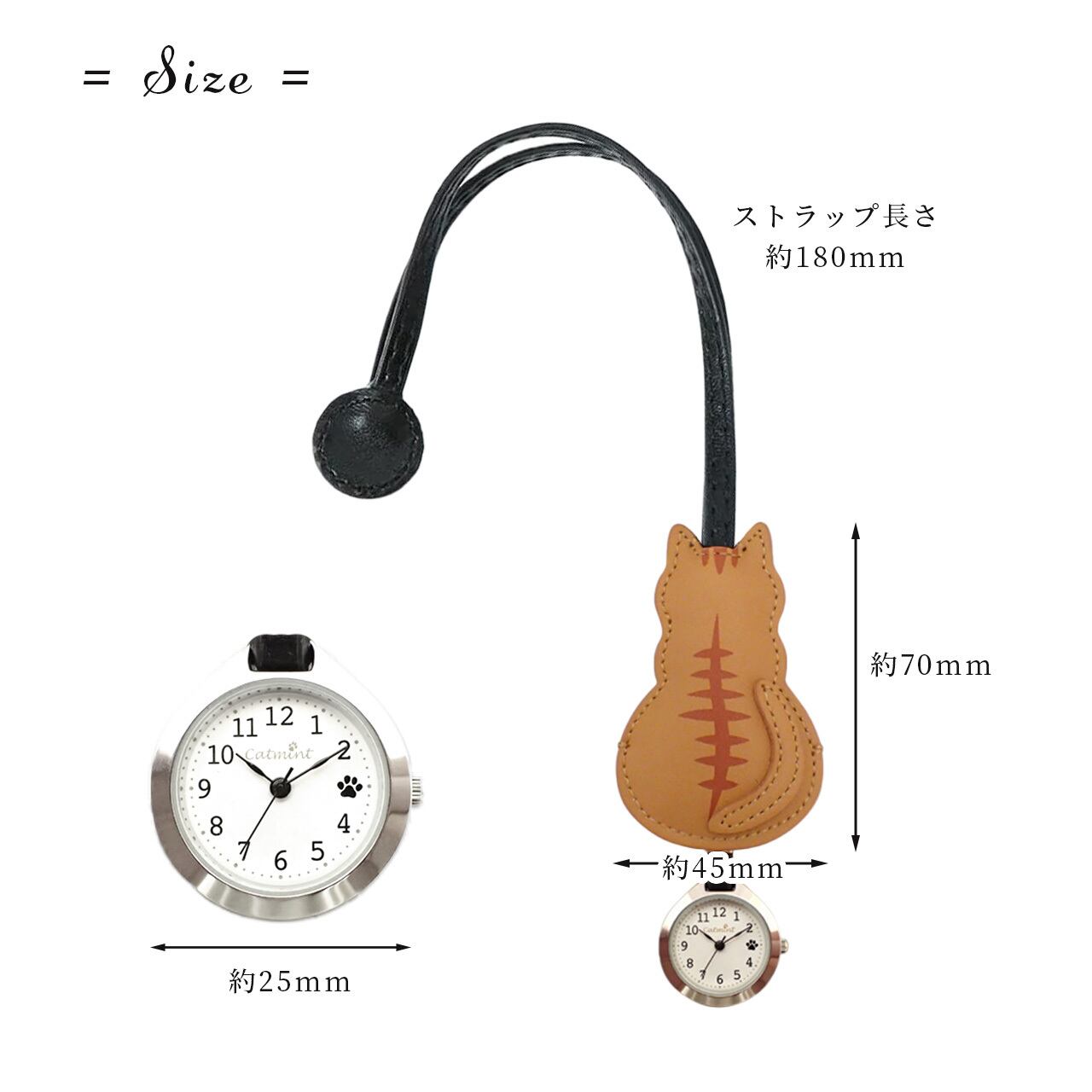 まあるいお尻でたたずむ姿がたまらない、猫の後ろ姿をモチーフにしたハングウォッチです。 バッグチャームとしても可愛いアクセントになり、猫型のカバーをサッとスライドさせるだけで時計が見えるので便利です。 盤面はシンプルなデザインで見やすく、3時の数字が肉球になっているのが可愛くてオシャレですね♪ ケースサイズも約25mmと小さすぎずちょうどいいサイズ感。 日本製ムーブメントを使用しており、メーカー保証もついているので、長く愛用できるアイテムです。 自分用にはもちろん、猫好きさんへのプレゼントにも喜ばれそうです♪