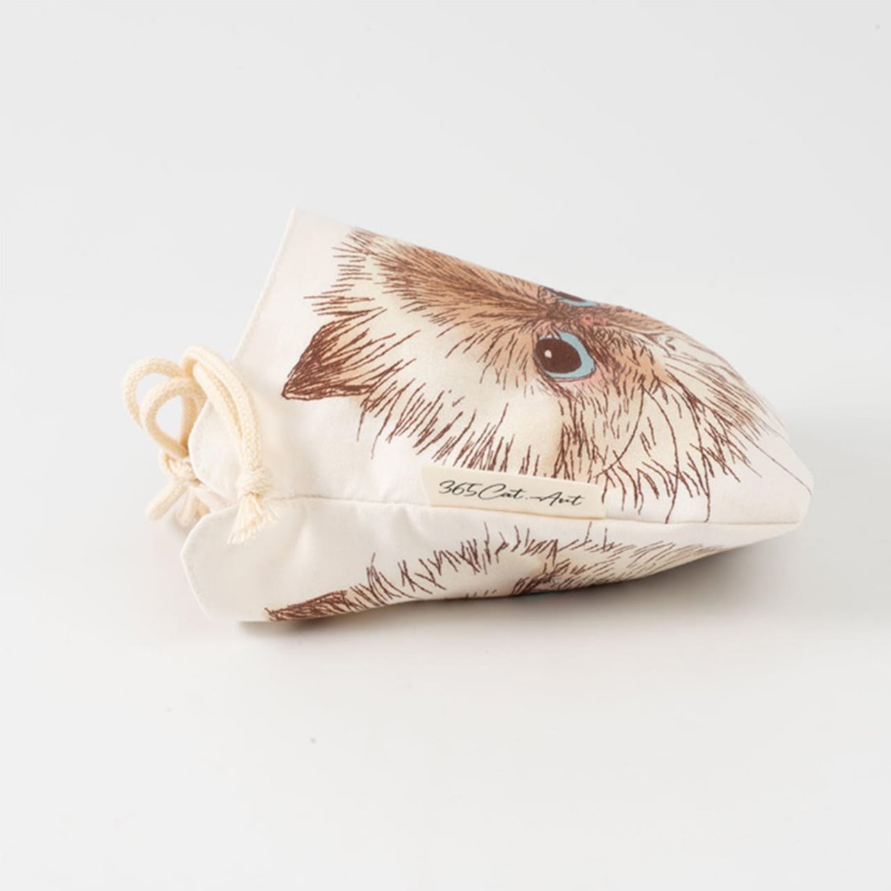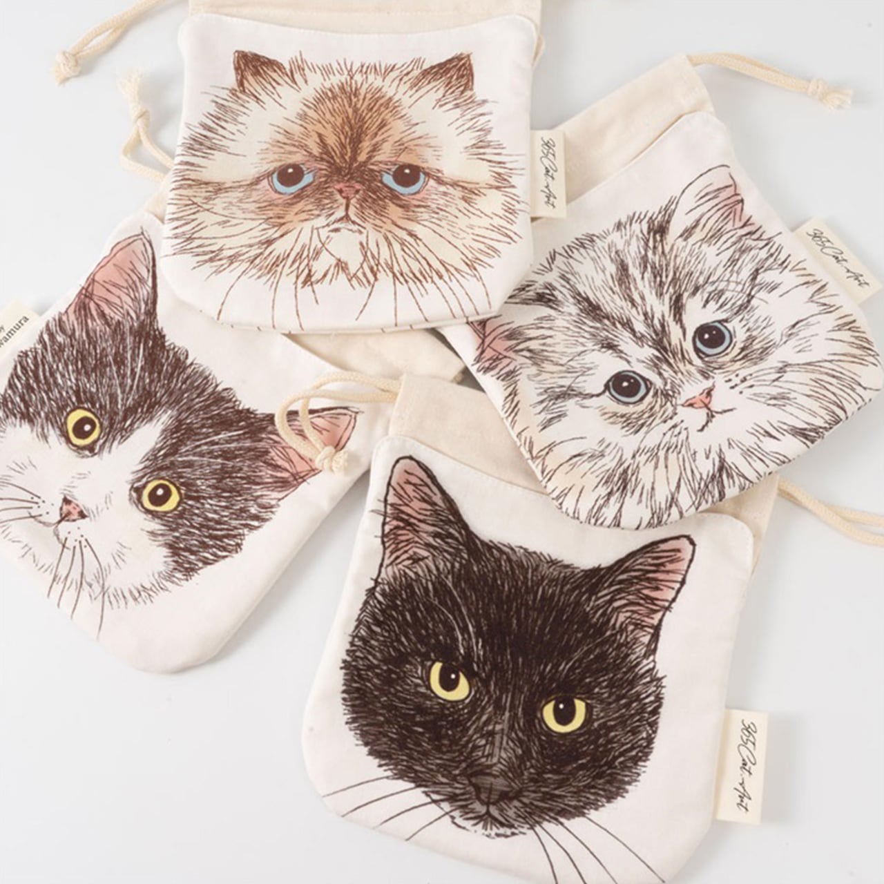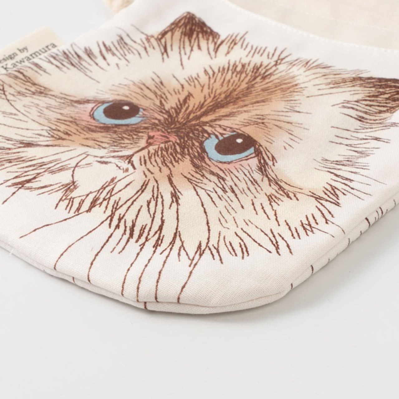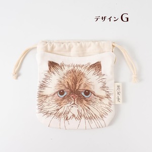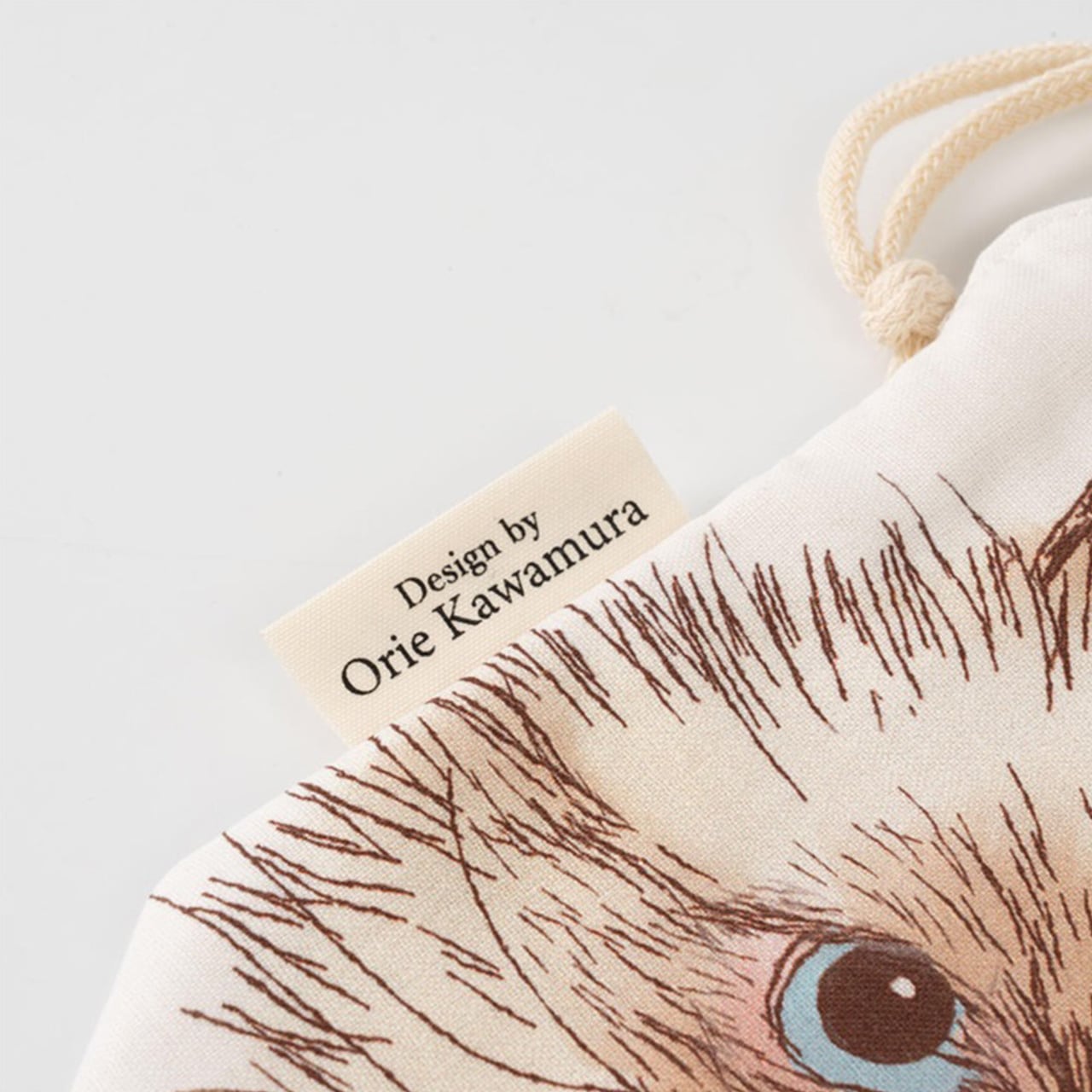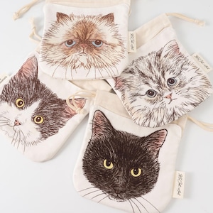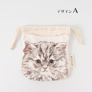 ORIE KAWAMURAさんの繊細なペン画で描かれた猫のお顔がとっても素敵な巾着ポーチ。絵柄部分と巾着部分は生地が独立しているので、紐を縛っても猫ちゃんのお顔はクシャッとならず、ポケットのように使えるのがオシャレで便利です。