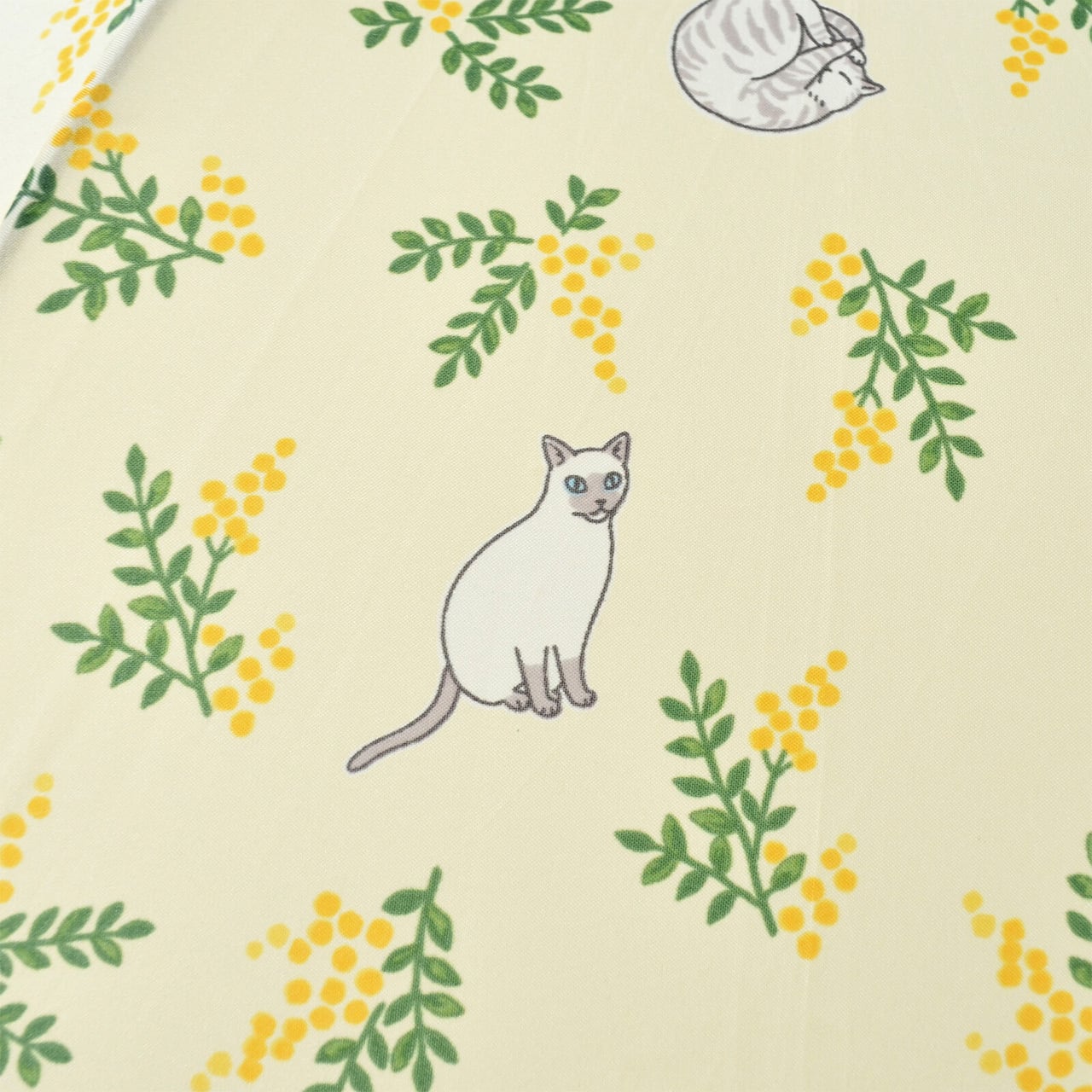 ふわふわのペルシャ猫にスマートなシャム猫、くつろぎすぎのハチワレにニャンモナイトになったトラ猫などなど、いろんな猫ちゃんが登場する上品でかわいい雨傘です。
