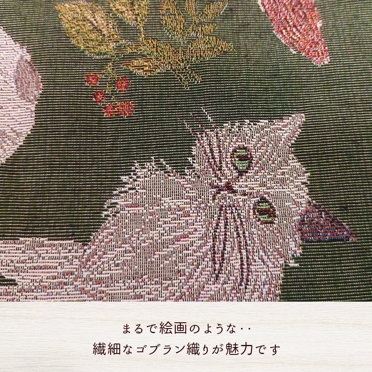 細い糸を使用することで、繊細なイラストを忠実に再現した、絵画のような趣のあるゴブラン織りミニトート。 お財布やスマホ、ハンカチなど最低限の持ち物でちょっと出掛けたい時や、席を離れる時のサブバッグ等として使うのにちょうどよいサイズ感です。軽くてかさばらない生地なので、バッグに入れて持ち歩くにも便利です。猫好きの方へのプレゼントにも人気のシリーズです。